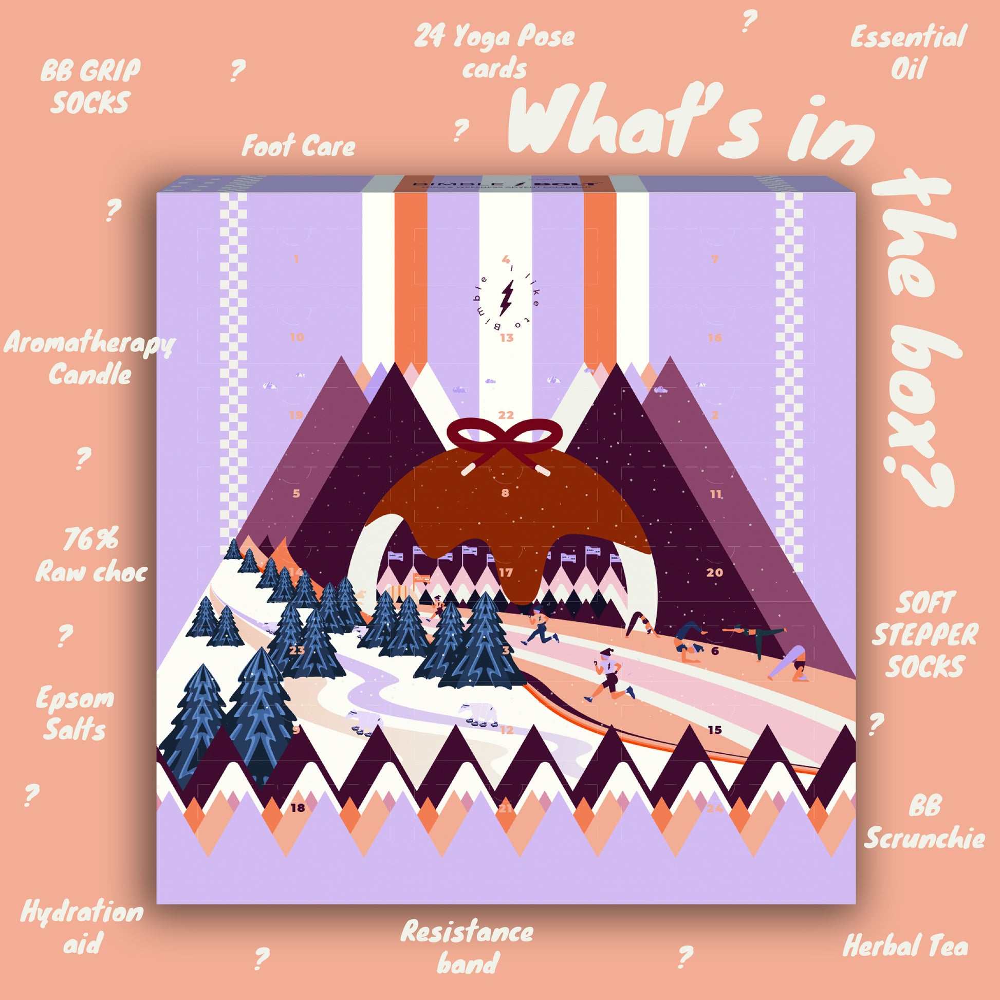 Welcome to Bimble and Bend, our wellness and Yoga-inspired Advent Calendar. A gentle nudge to prioritise self-care amidst the dark, wintry days and bustling Christmas chaos. Discover daily surprises designed to help you unwind, de-stress, and stay flexible throughout the festive season.
